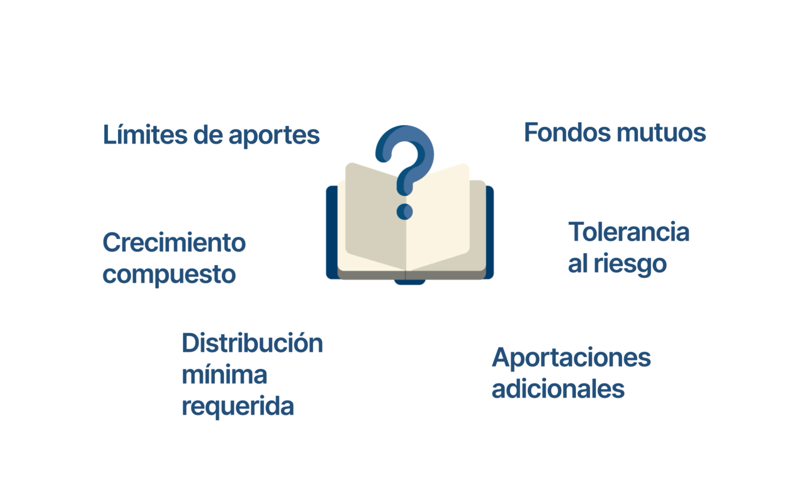| Aparece una mujer y luego emergen los términos: límites de aportes, fondos mutuos, crecimiento compuesto, tolerancia al riesgo, distribución mínima requerida, aportes adicionales. | No tiene que ser un experto para mejorar sus ahorros para la jubilación. Con estos conceptos clave a mano, estará en camino a ahorrar para una jubilación cómoda. |