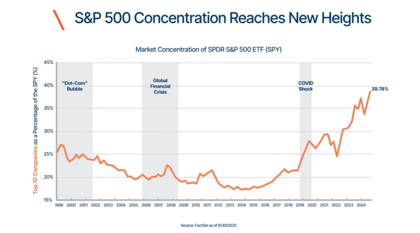 | The words S&P 500 Concentration Reaches New Heights appear at the top in dark blue, with an orange diagonal slash to the left. Below that, the subtitle reads Market Concentration of SPDR S&P 500 ETF (SPY). A line chart is displayed underneath: The vertical axis on the left is labeled Top 10 Companies as a Percentage of the SPY (%), ranging from 15% to 45%. The horizontal axis shows years from 1999 to 2024. An orange line represents the percentage over time, starting near 27% in 1999, dipping below 20% around 2010, then rising sharply after 2018 to about 39.78% in 2024. Three shaded regions mark events: “Dot-Com” Bubble around 2000–2002. Global Financial Crisis around 2007–2009. COVID Shock around 2020. At the bottom, the source is noted as FactSet as of 9/30/2025. | This chart shows how the 10 largest U.S.-based companies now account for nearly 40% of the S&P 500. That means a small group of companies now have a big influence on the market, which is a trend worth watching. |