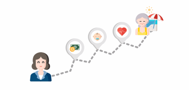 | A younger woman appears with a grey dotted line in between her and an older version of herself. Along the dotted line there are two arrows that say “promotion” and “new job” | As you reach different milestones, it’s important to adjust your retirement plan strategy to make sure you have enough savings for your desired retirement income. |