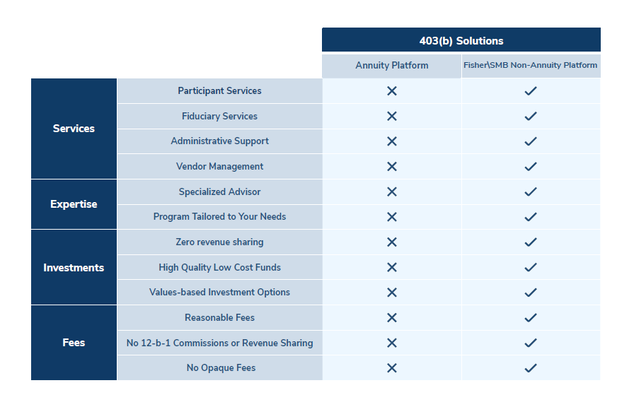 As a fiduciary advisor, Fisher\SMB helps nonprofits navigate, evaluate, and set up a 403(b) tailored to their objectives.